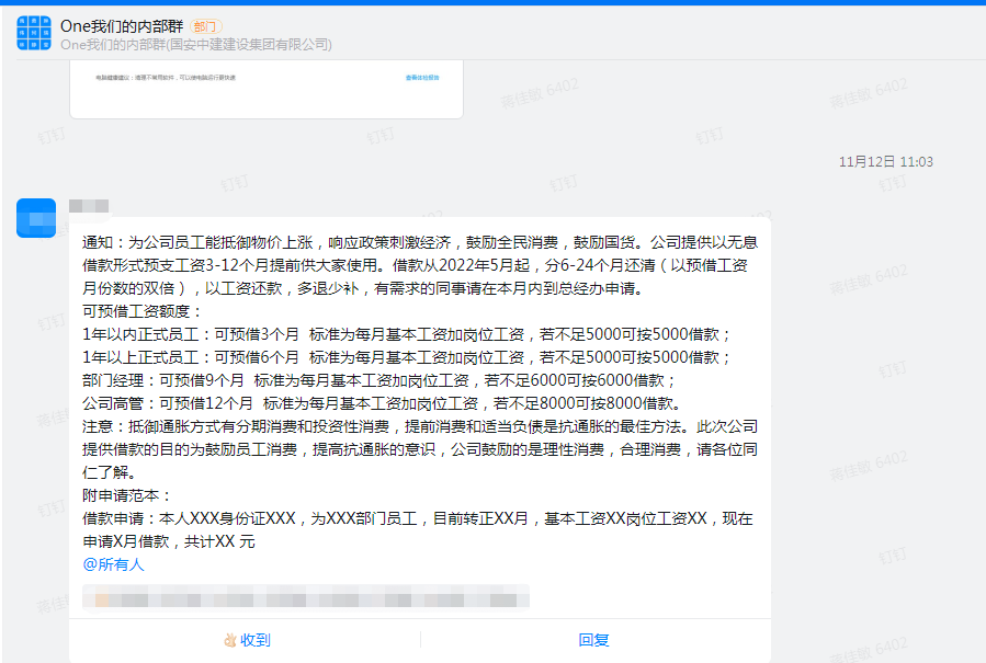 公司为全体员工能抵御疫情、通货膨胀等导致的物价上涨,响应政策刺激经济,鼓励全民消费,鼓励国货。宣布员工可预支3-12个月工资以无息借款形式供大家使用。借款从2022年5月起,分6-24个月还清(以预借工资月份数的双倍),以工资还款,多退少补。